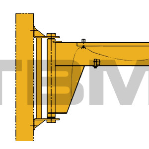 270°旋臂吊回转轴放在立柱上方的两个耳板上,上下耳板和回转轴之间配备平面支撑轴承及回转自润滑铜套,这样既保证了回转的灵活度又给旋臂回转停止时的惯性摆动增加了阻尼。回转角度外置限位,可调节旋臂的回转角度。这种结构可以有效减少旋臂吊整体净空高度。270°回转默认为手动回转。 |